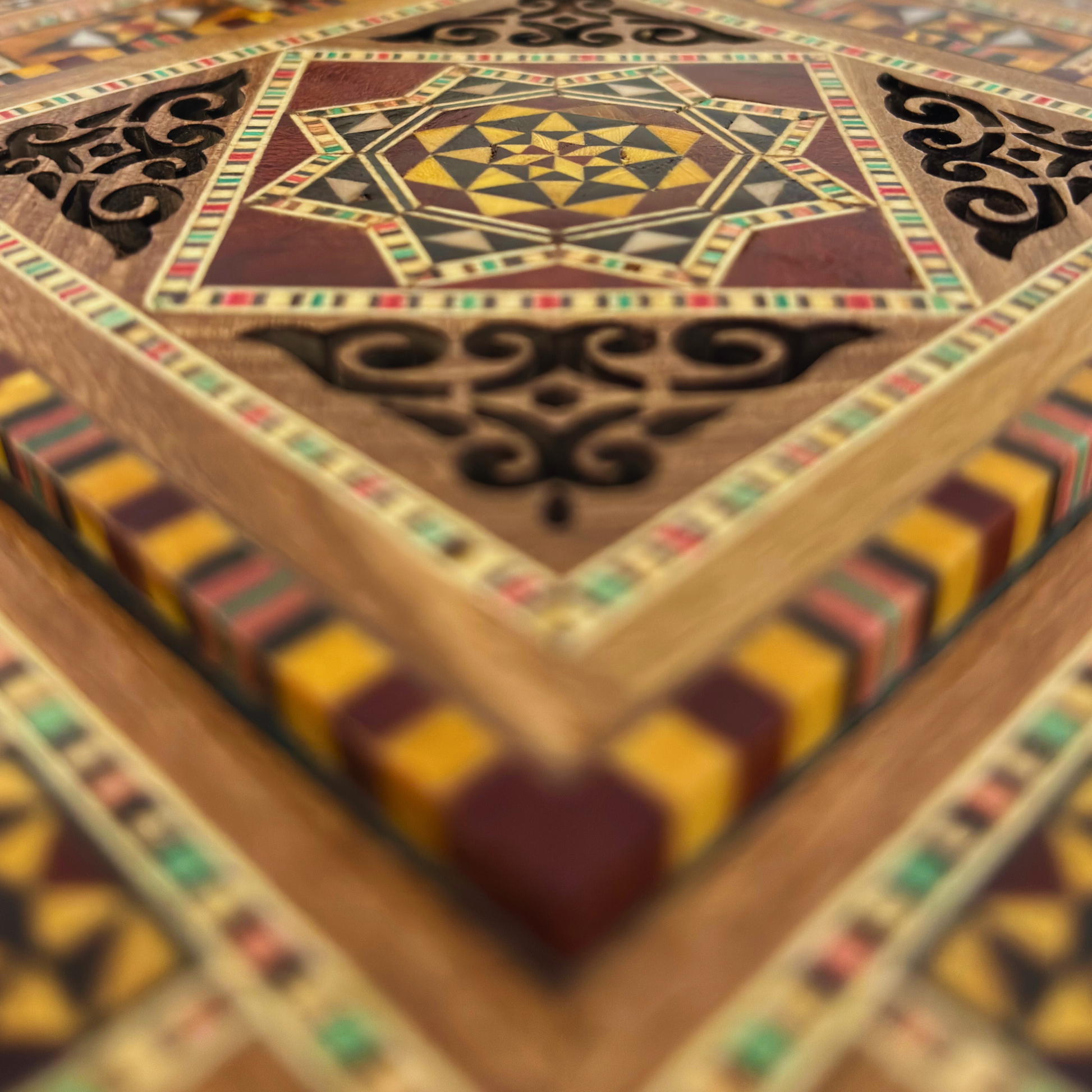 Crafted from fine beech, lemon, walnut, eucalyptus and rosewood in the historic old city of Damascus, this square mosaic box showcases exquisite handcraftsmanship and traditional artistry. Its elegant mosaic design offers a sophisticated way to store jewelry, precious trinkets, cigars or keepsakes, blending beauty and practicality.