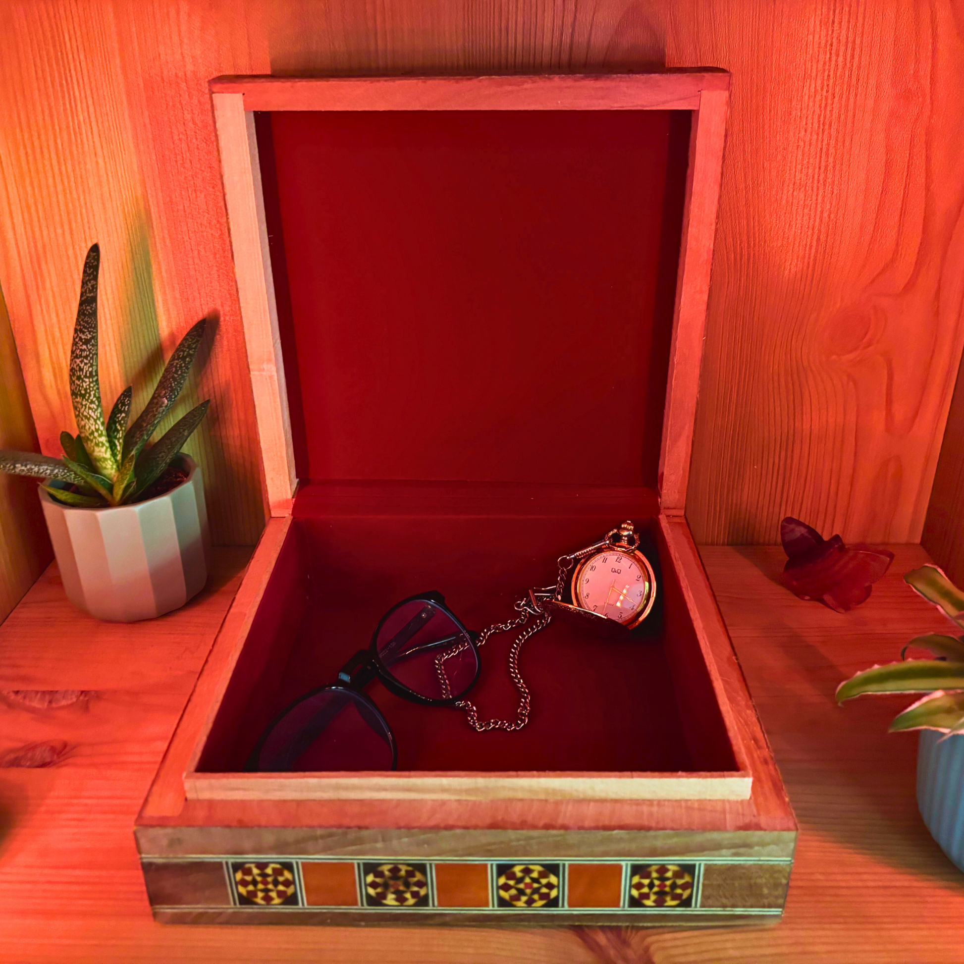 handmade Damascene mosaic box, medium square mosaic box, beech wood jewelry box, mother of pearl inlay box, oriental keepsake box, Syrian mosaic art, mosaic gift box, velvet lined jewelry box, handcrafted wooden trinket box, Damascus artisan box, traditional mosaic decor, gift for her, mosaic box for special occasions, unique anniversary gift, elegant handmade storage box, Damascus box, Syrian box, gift for him