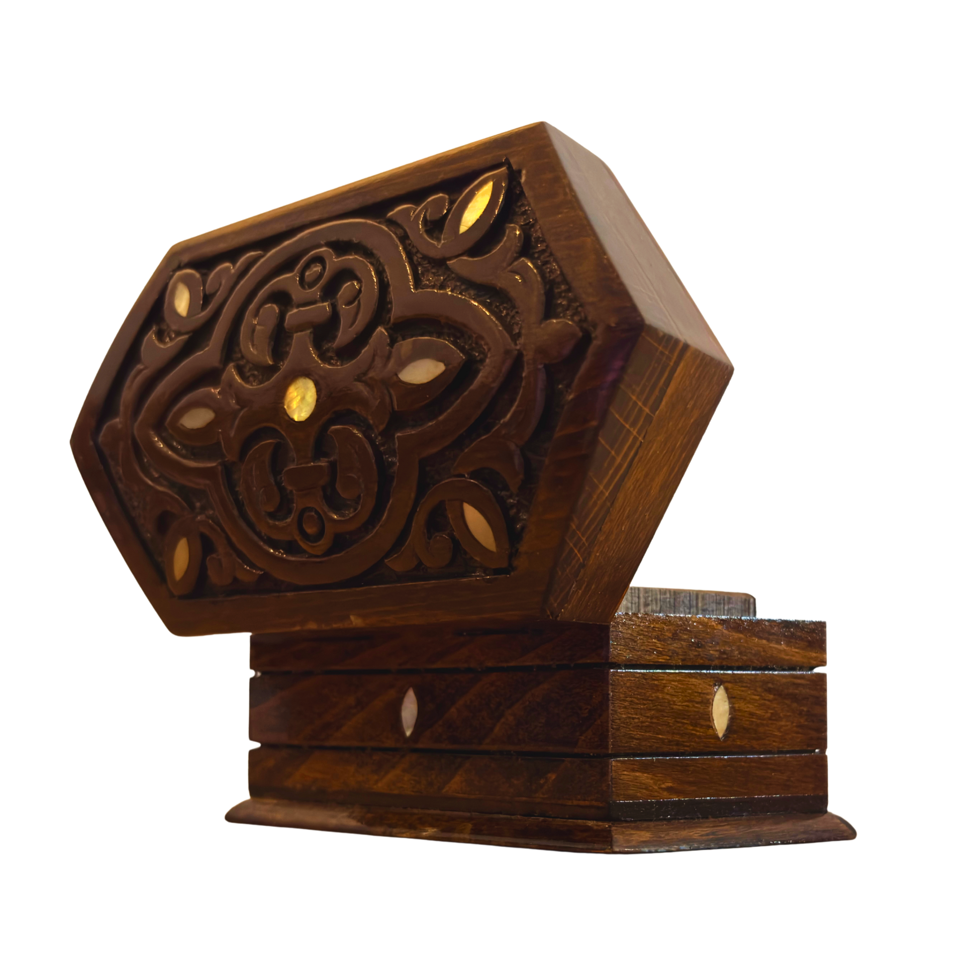 Bu zarif Şam kutusu, el oyma detayları ve doğu motifleriyle Suriye’nin köklü el sanatlarını yansıtır.